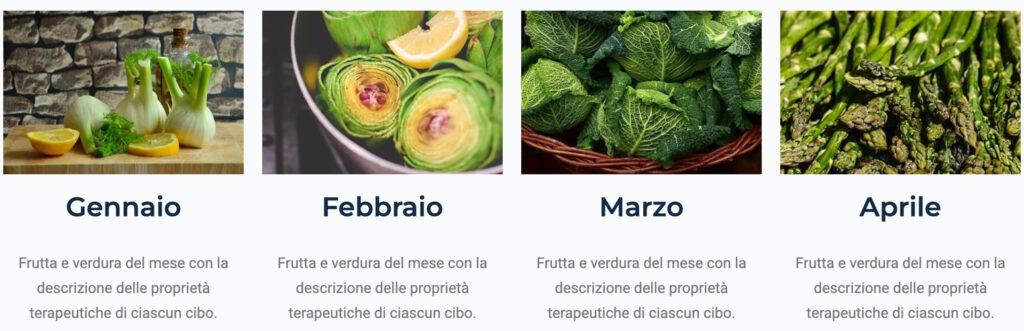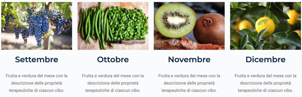Calendario mensile con la frutta e verdura di stagione che ne svela le proprietà scientifiche e informazioni utili sull’uso.