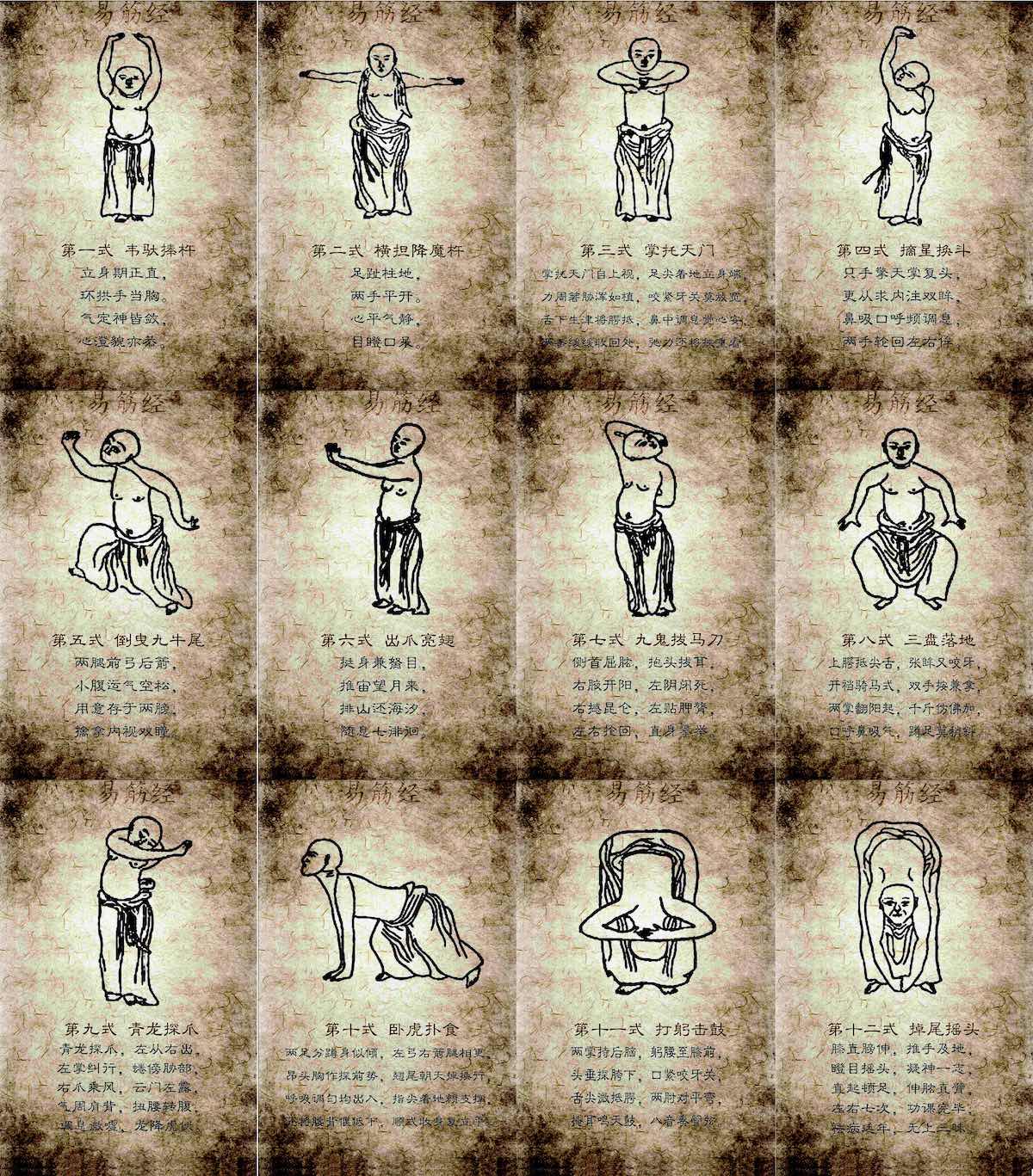 Yi Jin Jing era noto per essere praticato dai monaci del Tempio Shaolin. La parola “Yi” significa cambiamento o trasformazione. La parola “Jin” significa muscoli/tendini/legamenti. E la parola “Jing” significa sutra, e molto spesso viene tradotto come “classico” per indicare un’opera di valore. Yi Jin Jing è un insieme di posizioni che possono trasformare e rinnovare muscoli e tendini del corpo, rendendoli forti, flessibili e sani.